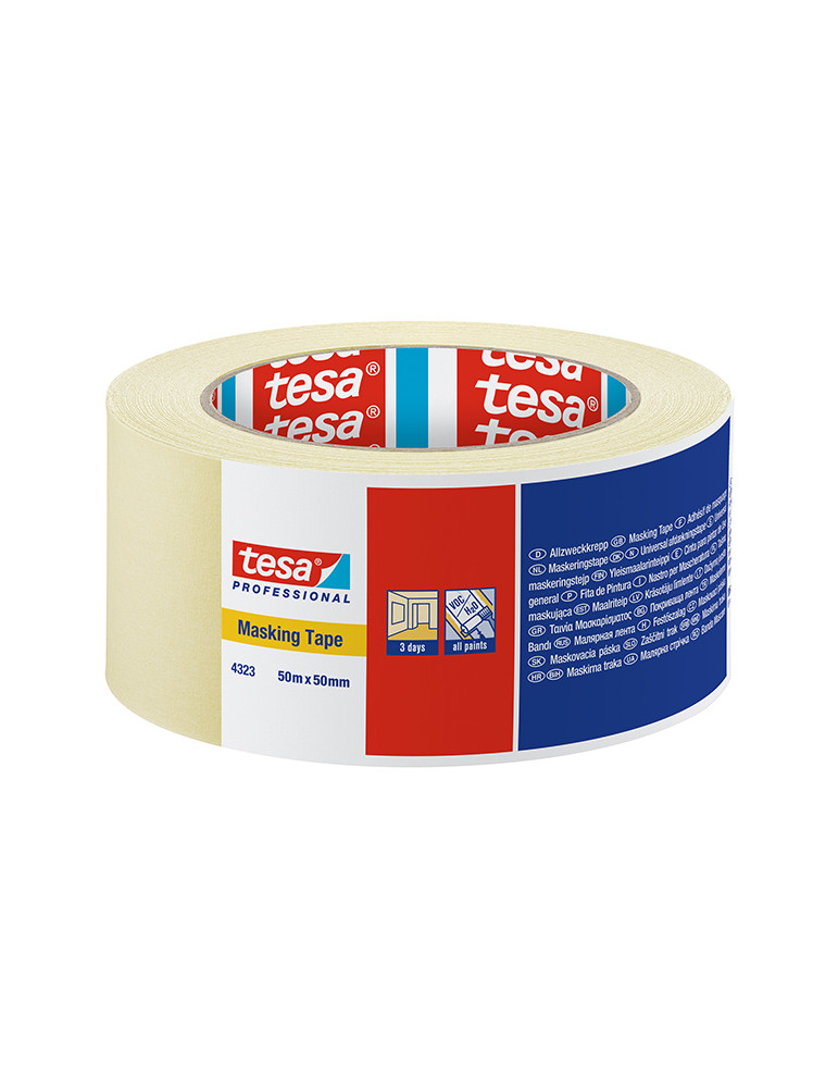 CINTA PARA PINTAR TESA TAPE Uso general con etiquetado individual. Adhesión fuerte y segura. Se retira limpiamente y sin dejar residuos, hasta un máximo de 7 días (en interiores). Rollo de 50 m x 19 mm.