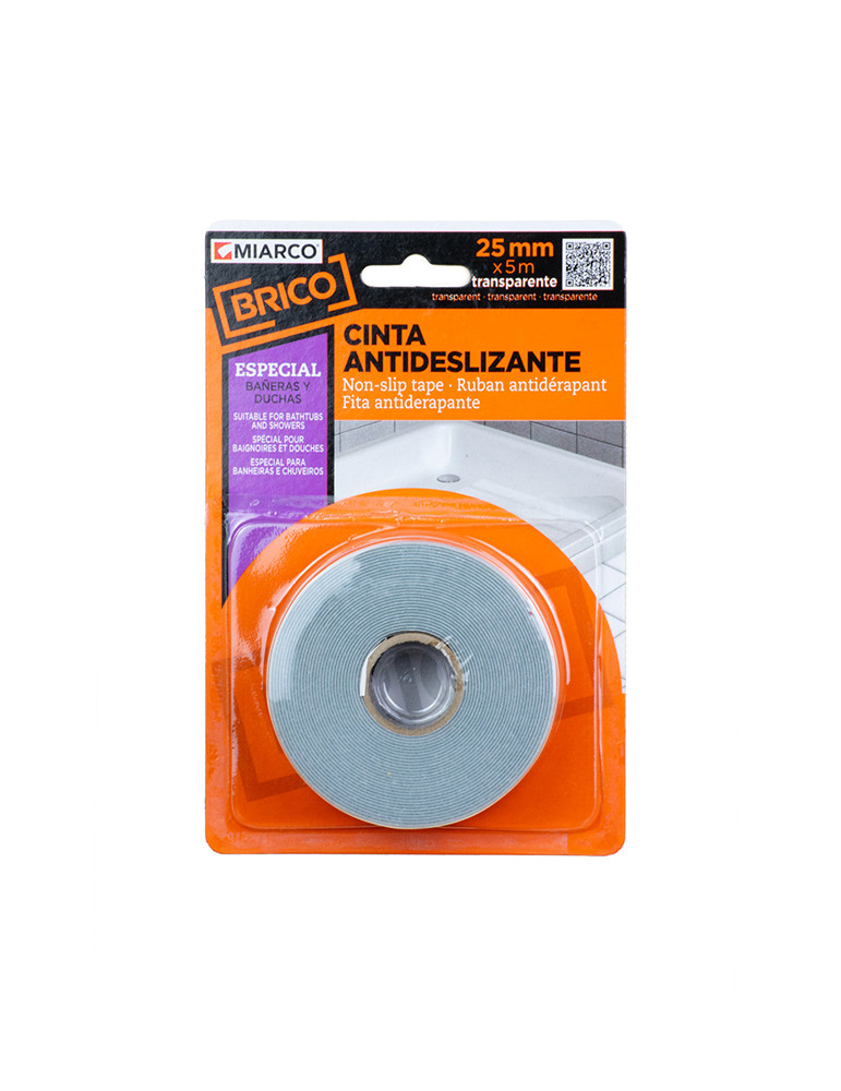 Cinta autoadhesiva de PVC con acabado antideslizante. Uso interior y exterior. Resistente a la radiación UV y a condiciones climatológicas normales. Buena resistencia al agua. 25 mm x 5 m.