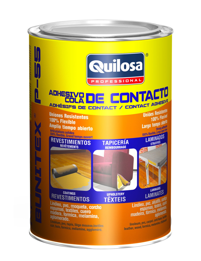 ADHESIVO CONTACTO BUNITEX P-55 QUILOSA Adhesivo de contacto. Uniones flexibles resistentes y duraderas. Fuerte agarre inicial, tiempo de trabajo largo. 1 l.
