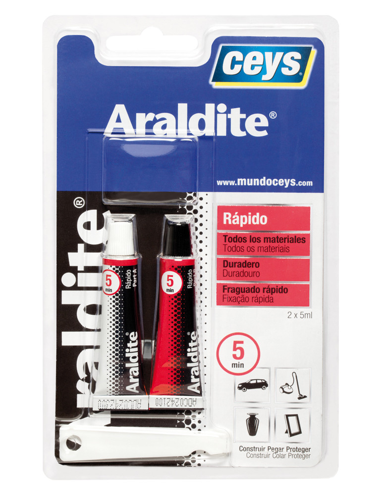 Seca rápidamente, resiste golpes y vibraciones, indicado para unir y rellenar superficies pequeñas. 5 + 5 ml.
