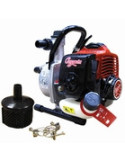 Motor 2 tiempos de 26 cm3. Caudal máx: 6.600 l/h. Altura manométrica 32 m. Autoaspirante 8 m. Bomba en aluminio ASP e IMP 1”-25 mm. Peso 5,5 kg. Economica y ecologica, made in japan.