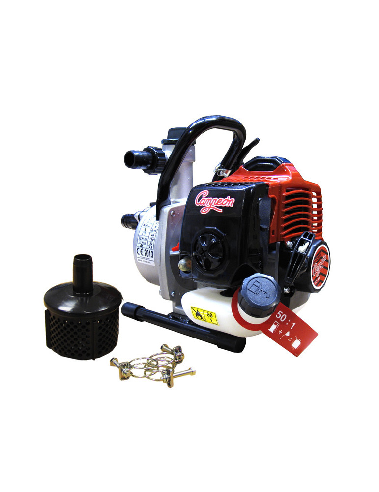 MOTOBOMBA AT-25 CAMPEÓN Motor 2 tiempos de 26 cm3. Caudal máx: 6.600 l/h. Altura manométrica 32 m. Autoaspirante 8 m. Bomba en aluminio ASP e IMP 1”-25 mm. Peso 5,5 kg. Economica y ecologica, made in japan.