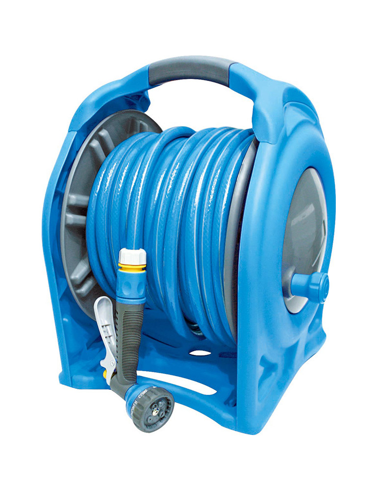 Incluye soporte porta mangueras, con posibilidad de fijación a pared o uso móvil gracias a su diseño con asa, una manguera de 15 m (13 mm ½´) y todos los accesorios necesarios para su instalación además de una pistola multichorro.