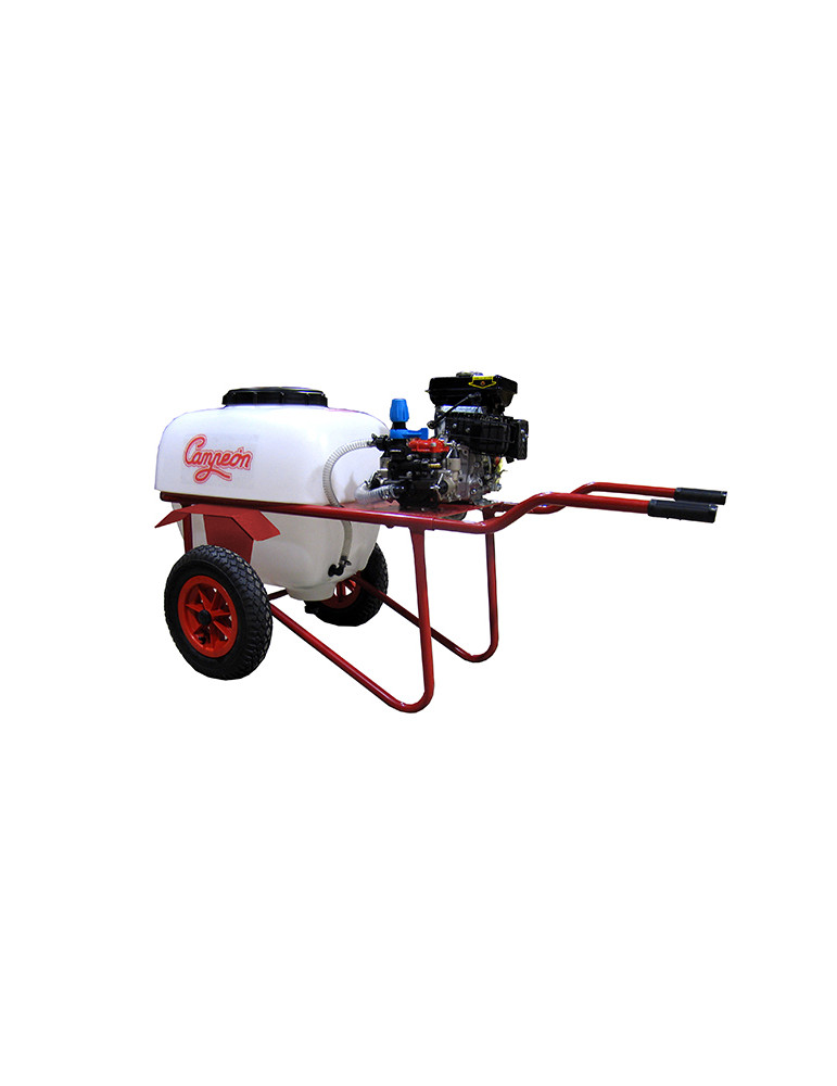 CARRETILLA PULVERIZADORA A GASOLINA CP4-1002 CAMPEóN 100 L. Motor 4 tiempos campeón. Potencia 2,3 Cv. Bomba BERTOLINI STRIP de membrana 20 Bar-17l/m Rueda neumática, Manetas abatibles para almacenaje, Depósito en polietileno alta densidad con escala visible, Incluido: 10 mt de manguera y pistola. Apta