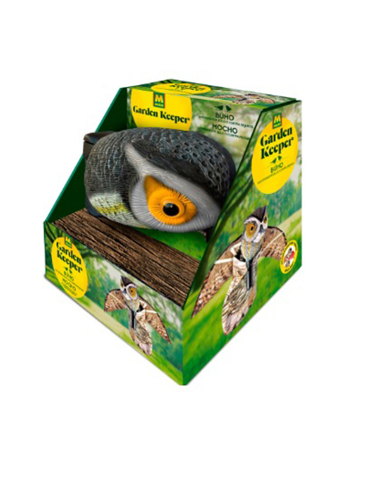La rotación de su cuerpo (360º), su color natural y la luz reflejada en los ojos le dan un aspecto tan real que consigue así disuadir todo tipo de aves de una forma natural.