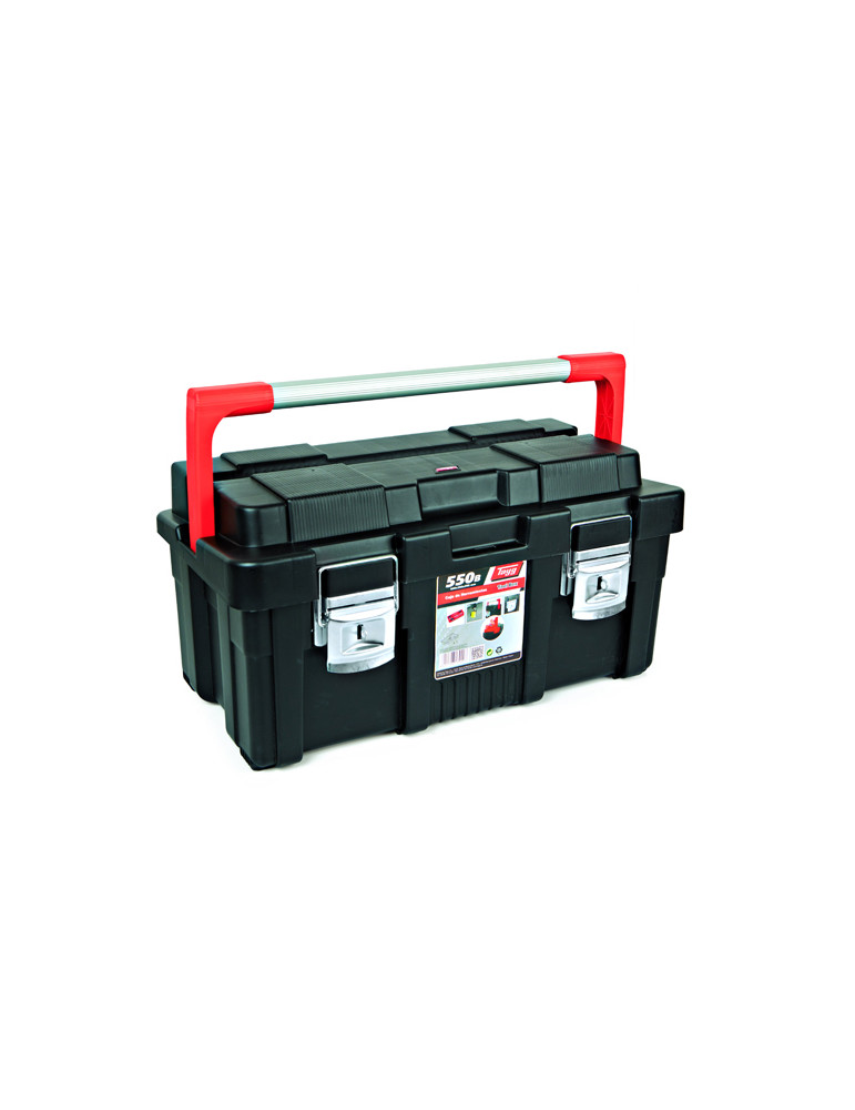 550 x 300 x 275 mm. 1 bandeja. Material PP, asa aluminio, cierres metálicos. Color negro, bandeja roja.