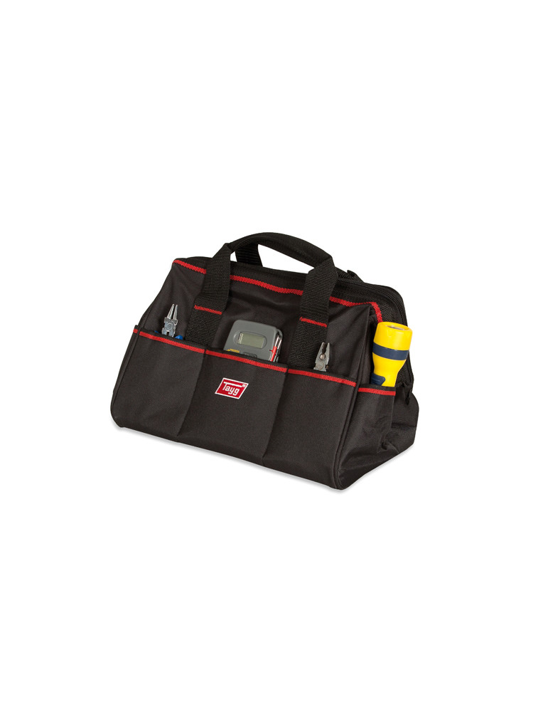 Medidas 345 x 220 x 225 mm. Material nylon. Color negro y rojo. Con 4 tacos de apoyo en el fondo. No incluye herramientas.