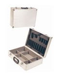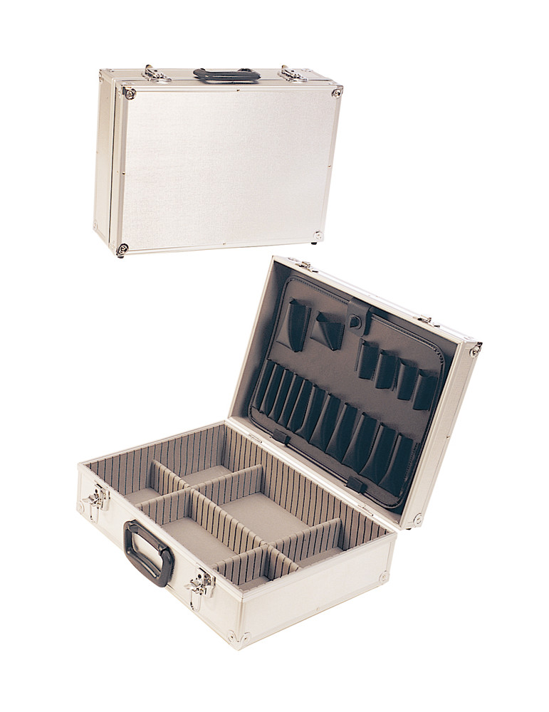 Maleta portaherramientas. Estructura de aluminio. Revestimiento interior de espuma prensada. Bandeja portaherramientas extraíble. Cierres de horquilla con llave. Bisagras de compás. Medidas 460 x 330 x 155 mm.