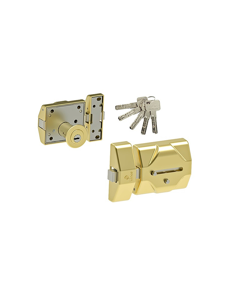 CERROJO SOBREPONER ALTA SEGURIDAD LATONADO MECANISMO SILENCIOSO, movimiento de cierre y apertura suave y silencioso. ANTI-TALADRO, ANTI-EXTRACCIÓN y ANTI-GIRO. BOMBILLO: ANTI-IMPRESIÓN, ANTI-BUMPING, ANTI-GANZÚA, ANTI-TORSIÓN…