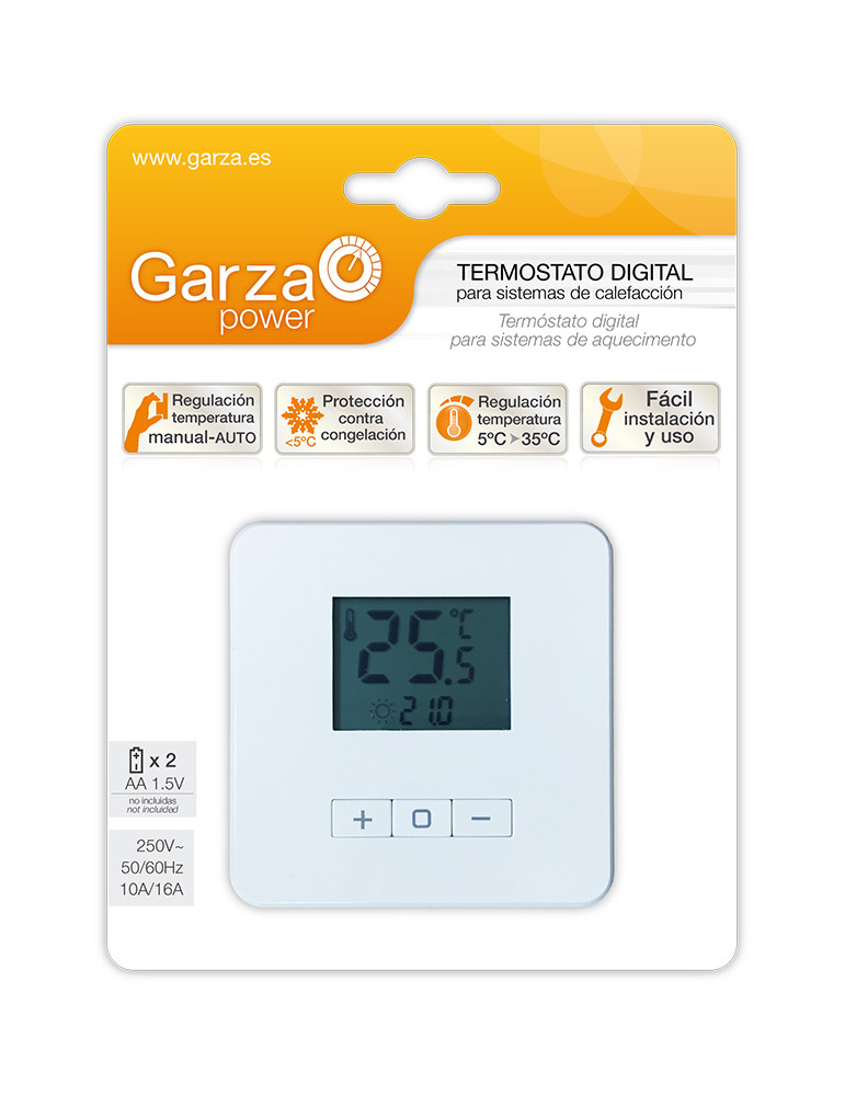 Cronotermostato digital con pantalla programable, temperatura auto y manual, protección contra congelación y regulación de temperatura de 5 a 35º. Radiofrecuencia, inalámbrico