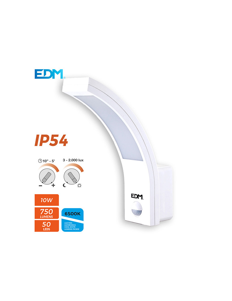 10 W. 750 Lumen. 6.400 K. Con sensor. Ángulo sensor 140º. 50 LED. Distancia max sensor 9 m. IP54.