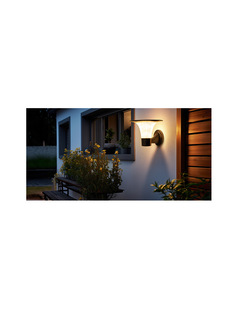 Aplique Luz Pared Solar Goliat Luz jardín exterior con alimentación solar y potencia de 2000lm. Luz cálida y neutra. Área de iluminación 80m2. Sensor crepuscular permanente. Sensor de movimiento. Funcionamiento 12h.
