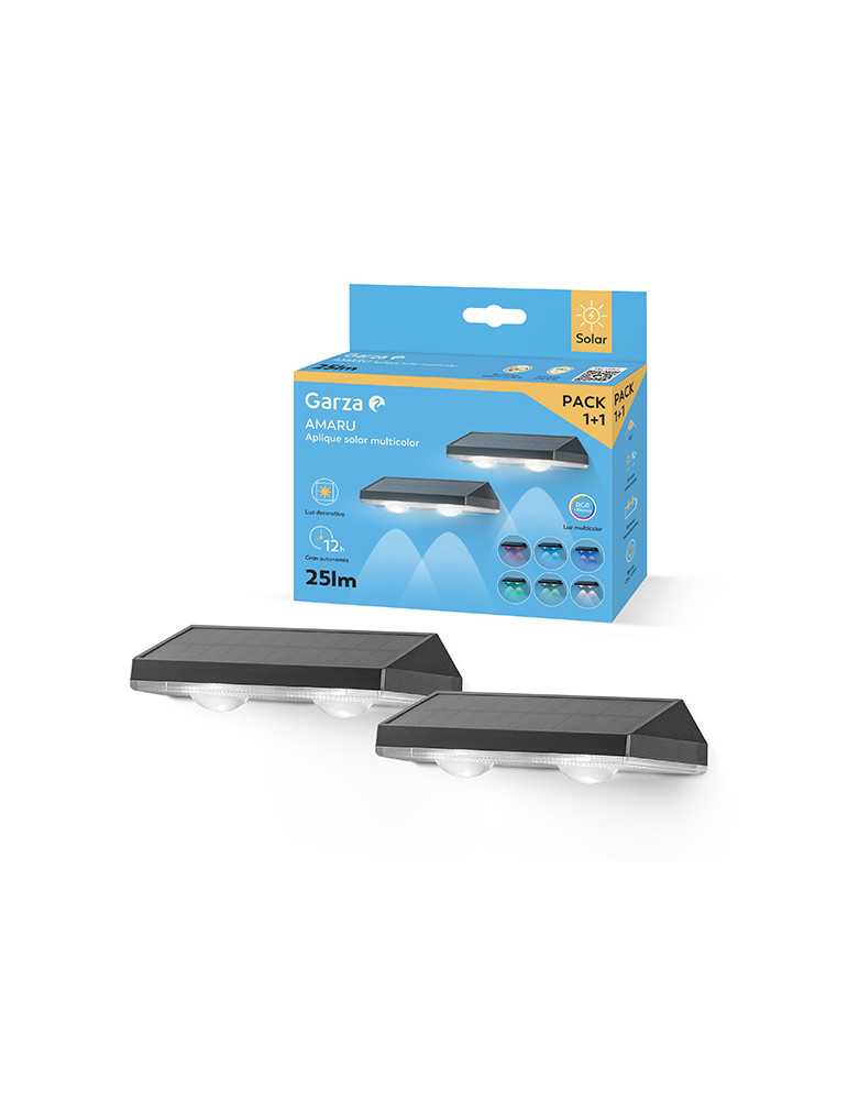 Pack de 2 apliques solares con luz multicolor 7 colores y luz blanca, creando un característico efecto decorativo. Con sensor crepuscular, 25 lúmenes y autonomía hasta 12h.