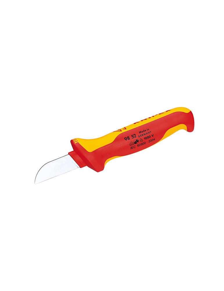 CUCHILLO PELACABLES RECTO VDE AISLADO 1.000 V KNIPEX Mango ergonómico, se adapta a la mano evitando deslizamientos y permitiendo una óptima transmisión de la fuerza. Con capuchón protector. Aislados 1.000 V. Conforme norma VDE / IEC 60900. Longitud 180 mm.