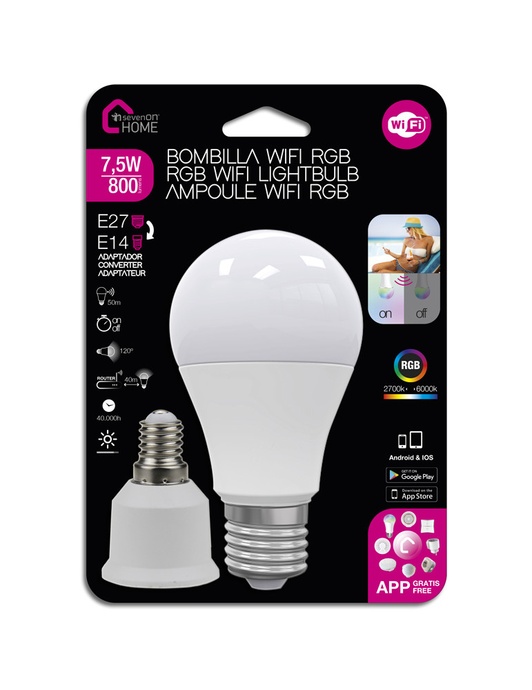 Control WiFi vía App. RGB + conversor E27 A E14. 806 Lm. Potencia 9 W programable. Compatible con Amazon Alexa y Google Assistant.