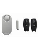 Alarma con mando a distancia para puerta. Activa la alarma con el mando a distancia desde el exterior al salir de casa, desactivándola al entrar antes de abrir la puerta. La alarma salta cuando la puerta se abre, o al detectar vibración ante golpes o