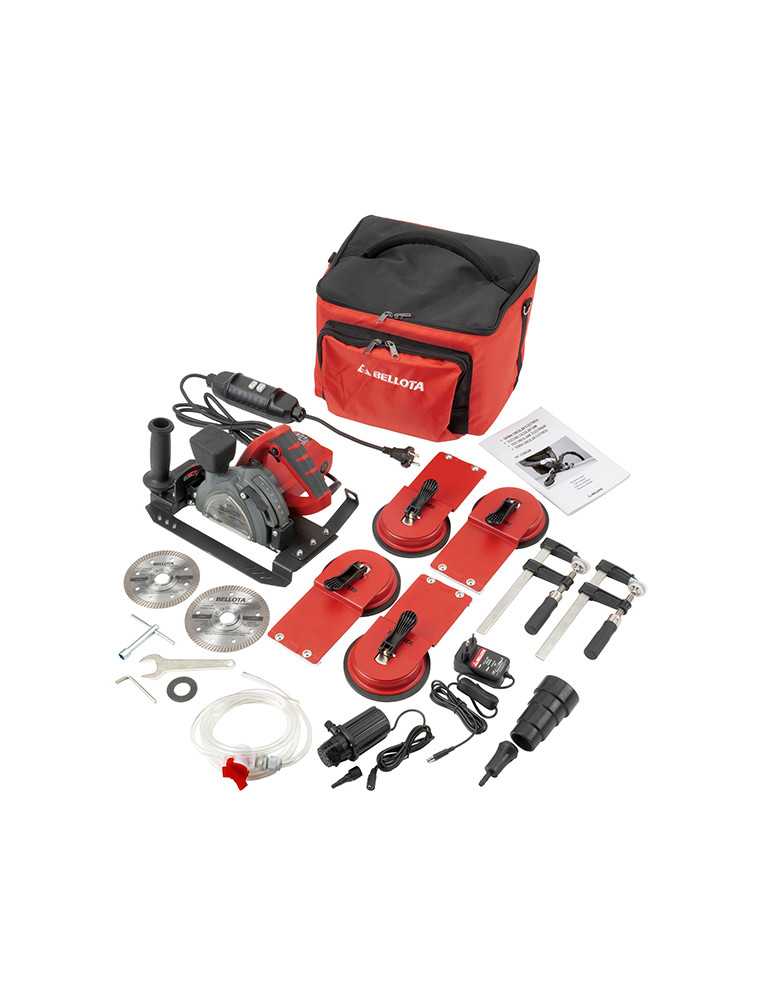 Potencia de 1.400W y 13.800rpm. Incluye: 1 disco de diamante de 115mm y otro de 125mm, 1 kit para corte húmedo, 2 mordazas, 4 ventosas, Manual y Bolsa de transporte.