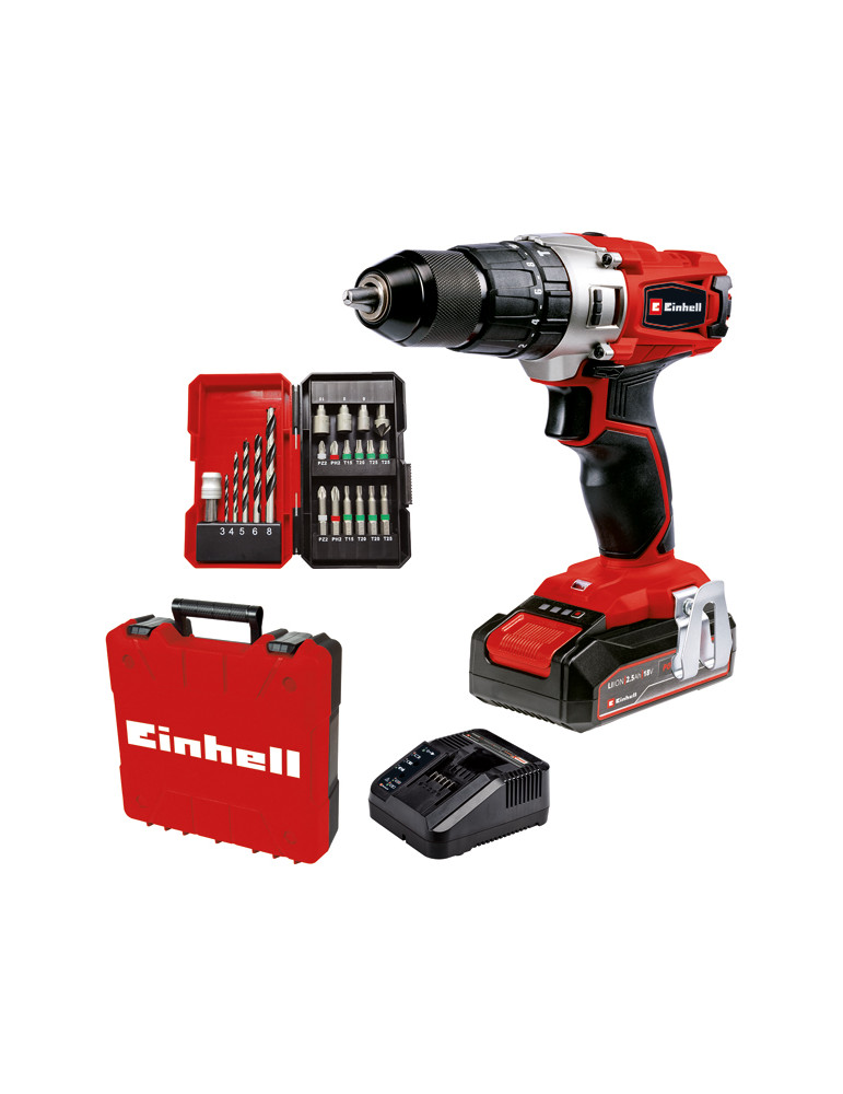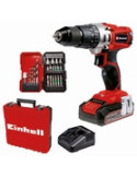 TALADRO PERCUTOR SIN CABLE TE-CD 18/2 Li-i + 22 einhell 18 V. 2500 mAh . Li-Ion. Número de marchas: 2. Velocidad de ralentí (marcha 1) 0-350 min ^ -1. Velocidad de ralentí (marcha 2) 0-1250 min ^ -1. Max. par de torsión fuerte 44 Nm. Número de pasos de par 20 ajustes. Portabrocas 13 mm.
