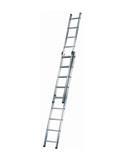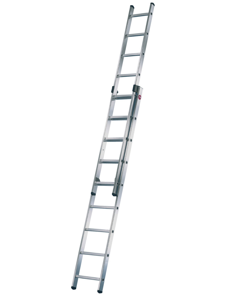 Telescópica de aluminio. Altura regulable peldaño a peldaño. Largueros y peldaños anchos. 2 tramos de 15 peldaños. 4,23 / 7,33 m.