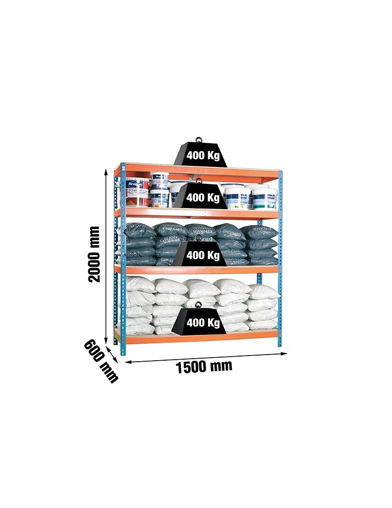 de 4 estantes de media carga. Montaje rápido y sin tornillos. Aguanta hasta 600 kg por estante. Incluye bandejas de madera. Las dimensiones son 200 x 150 x 60 cm y el color Azul y Naranja. Fabricado en España. No tiene aristas de corte.