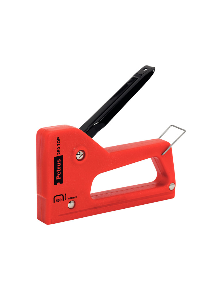 Clavadora plástica manual mod. 260 Top, para grapas 530/4 a 8 mm. Fabricada en plástico ABS, muy resistente, diseño actual y ergonómico. Destinada básicamente para bricolaje y hobby.