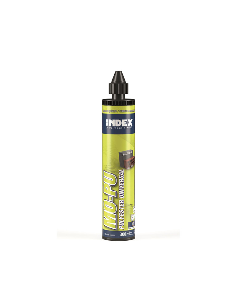 RESINA POLYESTER UNIVERSAL 300 ml. caja 12uds. INDEX .- Resina poliester Universal para todo tipo de materiales .- Homologación Europea CEE para Hormigón .- Válido para todas las aplicaciones en hormigón y mampostería. .- Empleo para cargas medias .- Válido para taladros secos, húmedos e inundados.