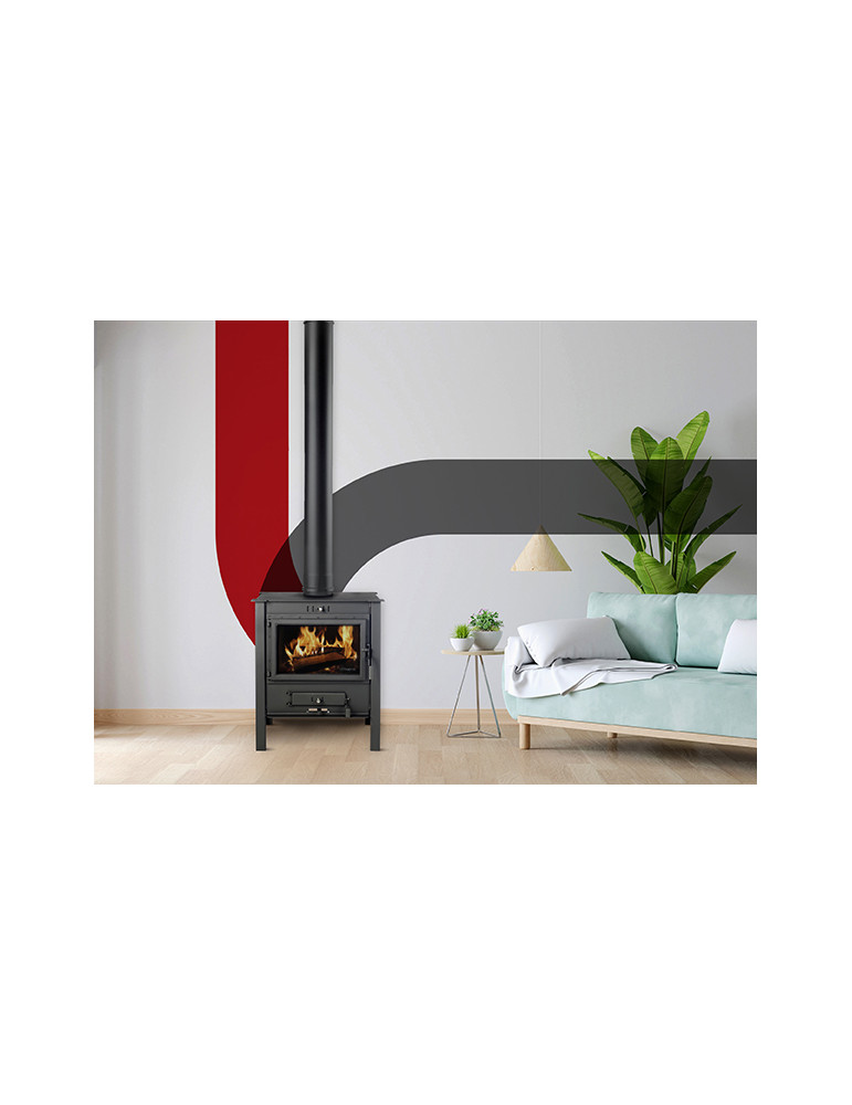 Potencia calorífica 18 kW. Carga 5 kg. Salida de humos 150 mm. Medidas (alto x ancho x profundo): 675 x 608 x 435 mm. Peso 66 kg. MODELO ALTO mm DIÁMETRO mm SALIDA mm