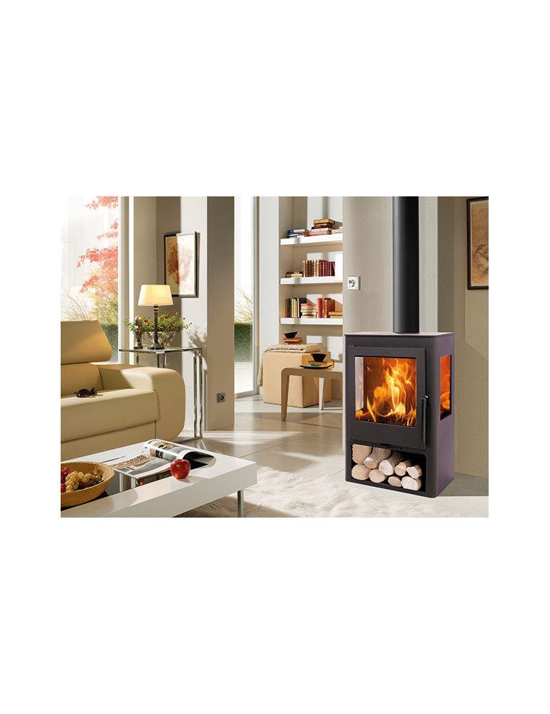 Conforme a EcoDesign 2022 con leñero en la parte inferior. Troncos de hasta 40 cm. Volumen de calefacción 150 m3. Sistema de cristal limpio. Triple combustión. Doble cuerpo en acero de 3+3 mm. Medidas 712 x 436 x 443 mm. Potencia nominal 5,5 Kw