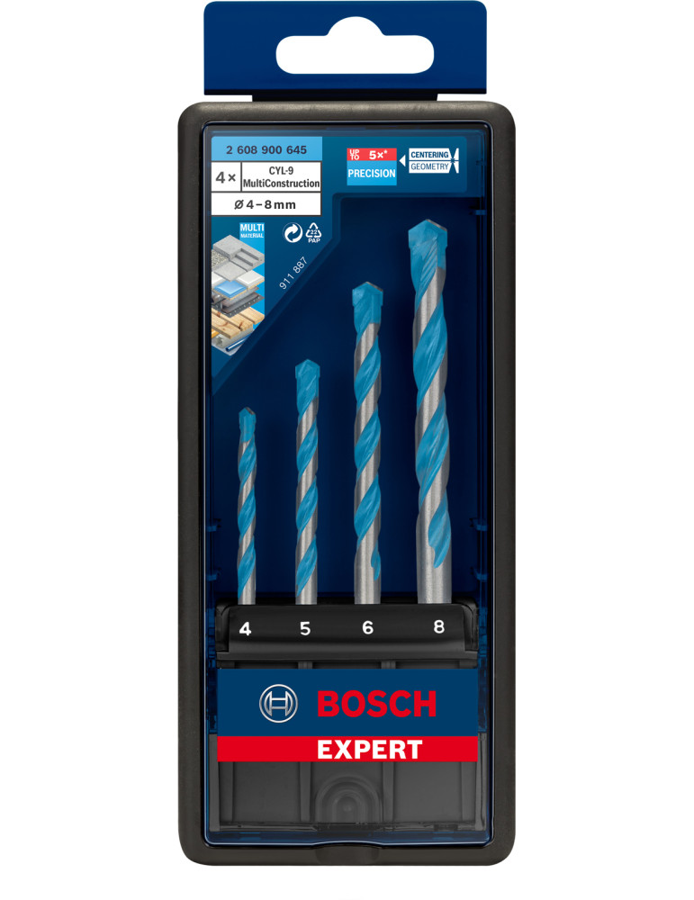 SET ROBUSTLINE CON 4 BROCAS EXPERT CYL-9 BOSCH Multiconstruction para taladrar prácticamente todos los materiales (madera, chapas de metal finas, hormigón, cerámica blanda…) o materiales multicapa. 4, 5, 6, 8 mm.