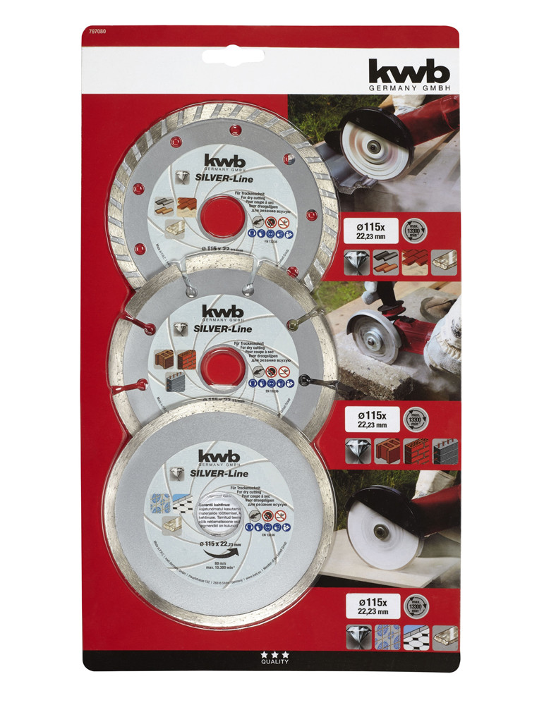 Se compone de un surtido de varios tipos de discos de diamante 115mm: 1 disco turbo, 1 disco segmentado y 1 disco liso. 115 mm.
