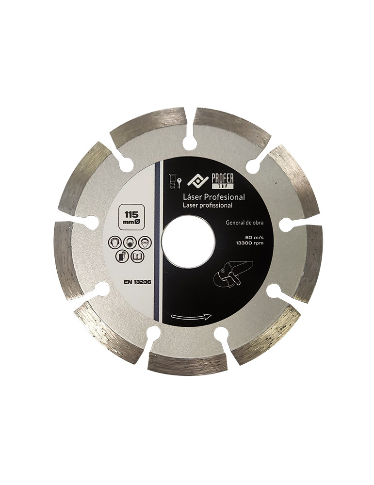 Disco diamante láser profesional PROFER TOP Cemento, ladrillo, refractarios, gres, terrazo, granito y pizarra. Segmentado con soldadura láser que garantiza un elevado rendimiento. 230 x 7 mm.