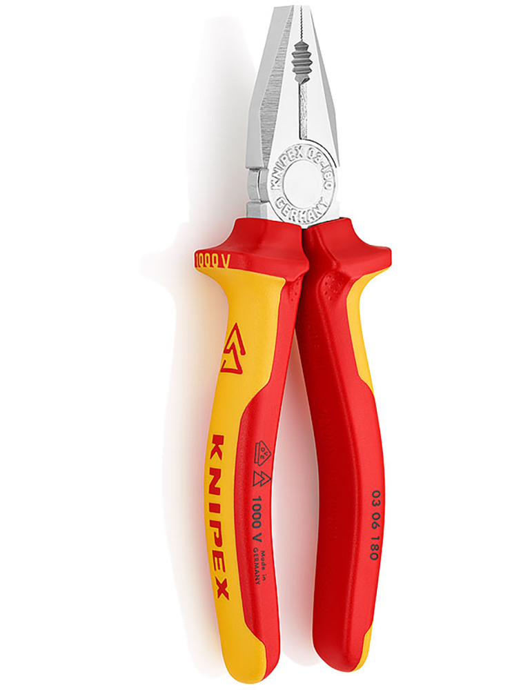 ALICATES UNIVERSALES VDE AISLADOS 1.000 V KNIPEX Filos templados por inducción con dureza 60 HRC. Gran capacidad de corte. Aislados 1.000 V. Conforme norma VDE / IEC 60900.