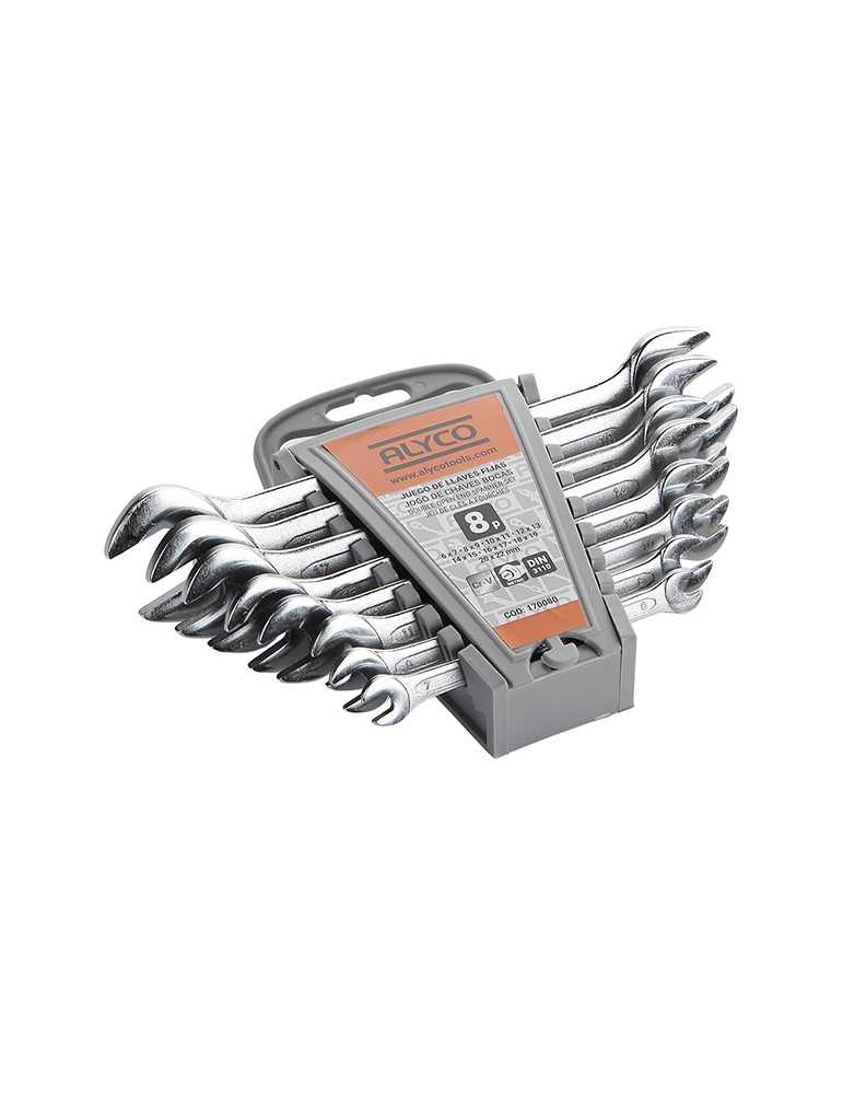 Juego de 8 llaves fijas de doble boca en caja de cartón, con soporte de plástico interior. Llave abierta de 2 bocas, fabricada en Acero al Cromo- Vanadio, forjada de una sola pieza, endurecida por tratamiento térmico