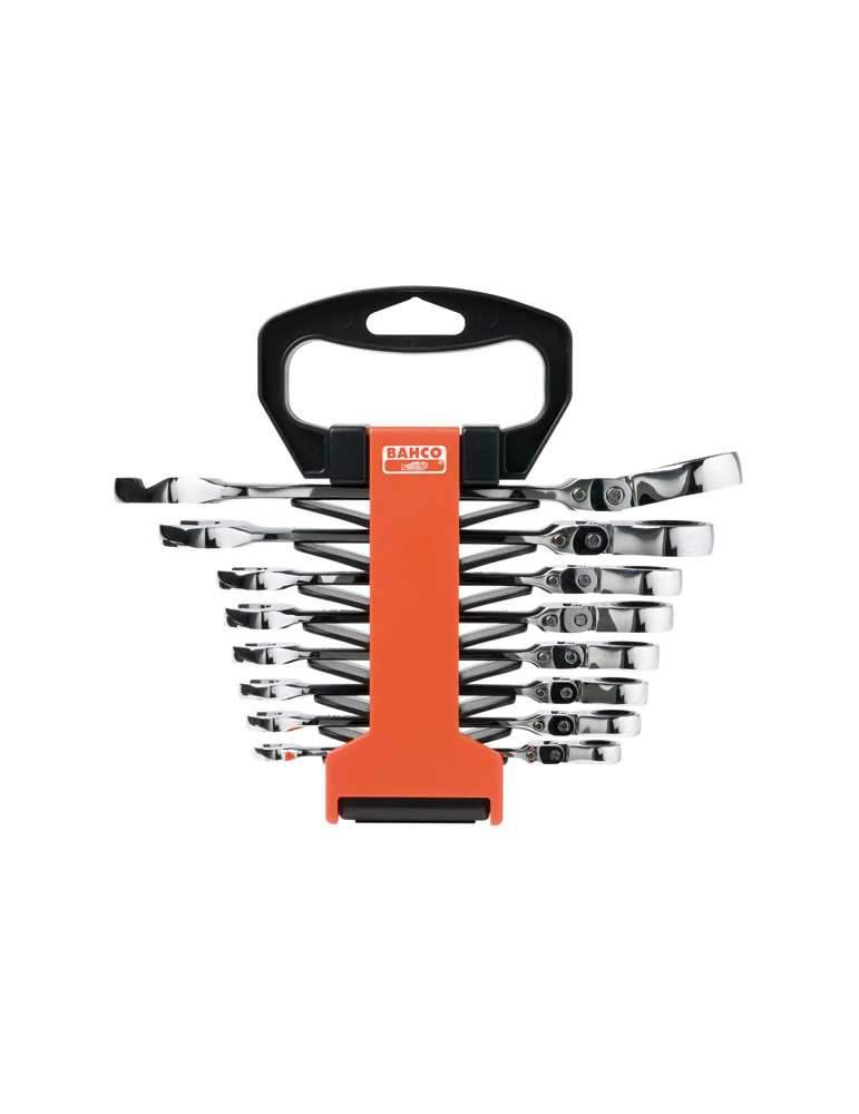 8, 10, 11, 12, 13, 14, 17, 19 mm. Cabeza flexible para acceder a espacios reducidos. Trabajos desde multitud de posiciones. Estuche con asa para su fácil transporte.
