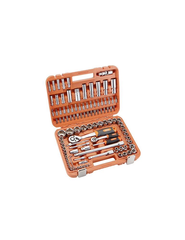 JUEGO VASOS 1/2” Y 1/4” DE 110 PIEZAS Alyco Juego de vasos 1/2” y 1/4” 110 piezas, carracas de 72 dientes.