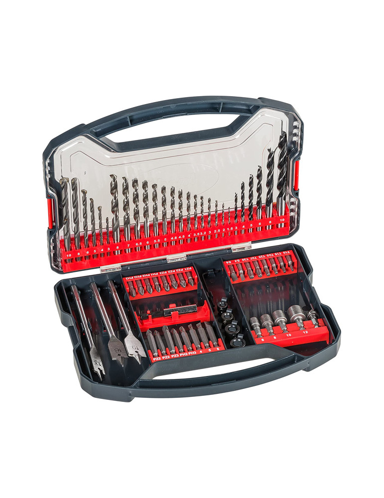 Extenso equipamiento básico con todos los tamaños. Adecuado para perforaciones y trabajos de fijación. Muy robusta caja con práctica asa para el Almacenamiento seguro.