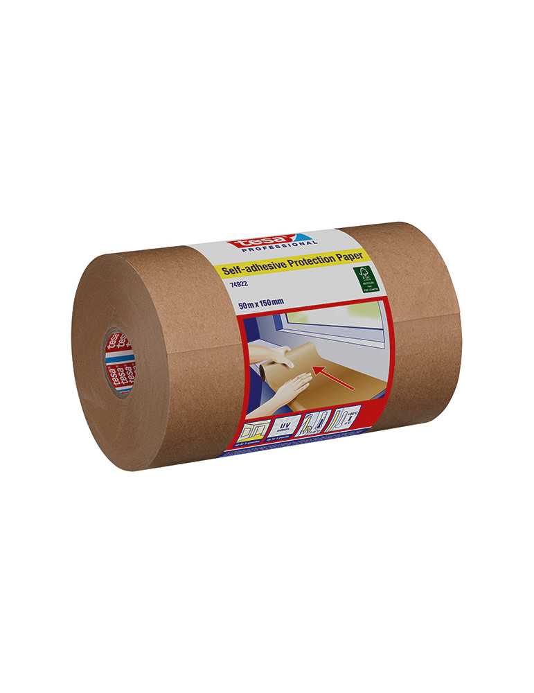 Papel de protección autoadhesivo de tesa® para una protección y una cobertura rápidas y limpias de grandes superficies, fabricado al 100 % con fibras recicladas y certificado por FSC®.Fácil aplicación para proteger de la suciedad, el polvo y las pequ