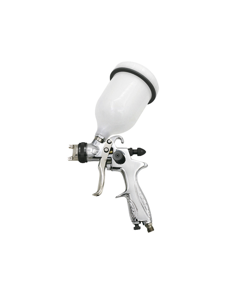 Cuerpo de acero y aluminio, depósito superior nylon 600c.c. Conexión rápida. Abanico 160-225mm, con regulación de aire y de material , boquilla de estándar en dotación 1,7mm
