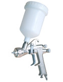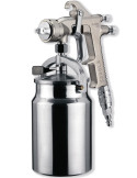 Depósito de 1 litro. Consumo de aire 240 l/min. 3,5 bar. Revestimiento antiadherente en el cuerpo de la pistola para facilitar su limpieza. Pico y aguja en acero inoxidable. Con filtro. Conector rápido.