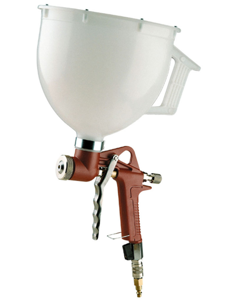 Fácil regulación y caudal de aire. Válvula de cierre para la entrada de aire. Depósito de 5 litros (con asa). Sistema anti-atasco. Paso de producto 4.5-6 y 8 mm.