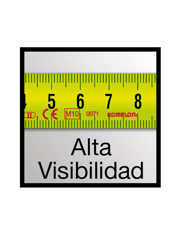 Caja cromada.Cinta alta visibilidad impresa a 2 caras horizontal y vertical. Uña magnética. Cinta extraancha recubierta de Nylon. Pantalón de trabajo de tejido hidrófugo elástico. Refuerzo en el tiro. Bolsillos frontales abiertos.