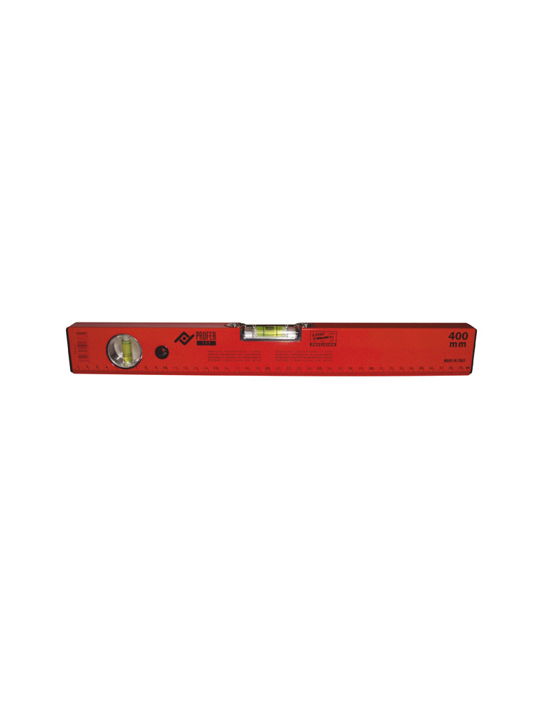 Burbuja central con tornillos ajustables y burbuja lateral. Precisión de 0,5 mm por metro. 40 cm.