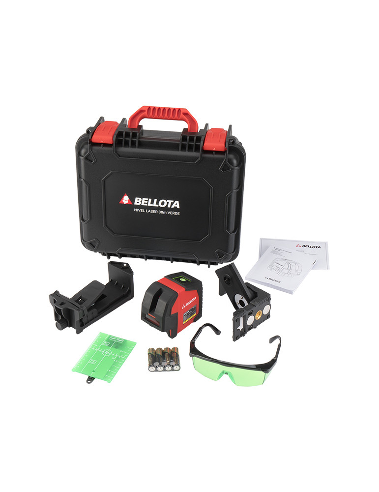 Nivel láser en cruz de 30 metros de alcance con plomada, autonivelante con precisión 0,3 mm/m, IP54 y bloqueo de péndulo. Incluye maleta, soporte magnético+pinza, gafas, placa reflectora magnética y pilas.