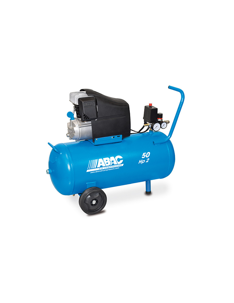 Compresor lubricado. 2HP, depósito 50 lts, 220 lts/min, 10 bar, monofásico, 70dBA, con ruedas. Indicado para uso bricolaje y trabajos ligeros. Tallas M - XXL. Colores beige/negro o gis/negro.