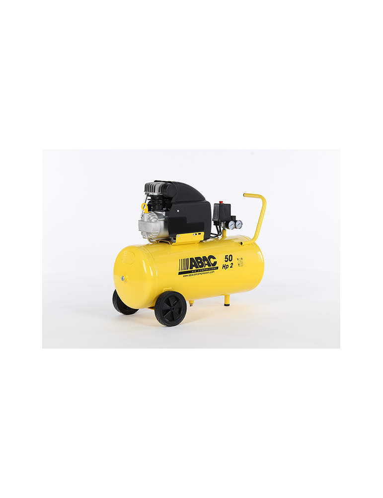 Compresor lubricado ABAC Serie BASE. 2HP, depósito 50 lts, 190 lts/min., 8 bar, monofásico, 68dBA, con ruedas. Indicado para bricolaje y trabajos ligeros.