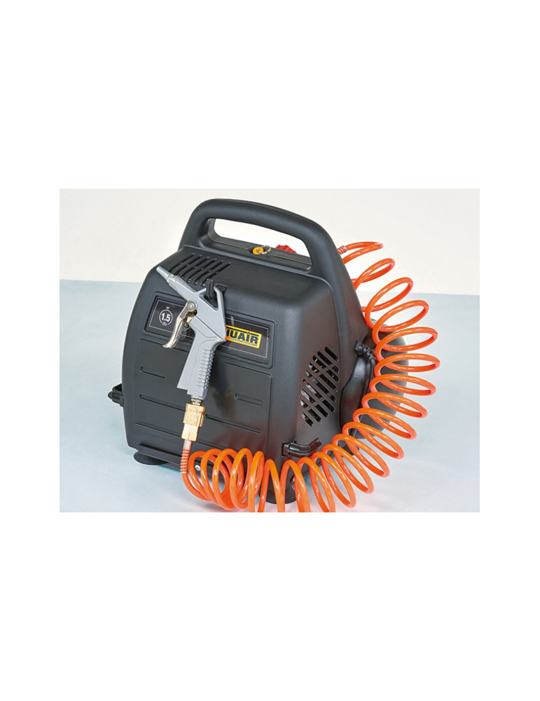 1 HP 6 LTS. 59 db(A) 8 bar. Sin aceite, extremadamente silencioso. Cabezal con motor de bajas revoluciones. Elevado rendimiento y gran fiabilidad. Cabezal de doble pistón de 1450 r.p.m. silencioso 59 db(A) Fácil transporte.