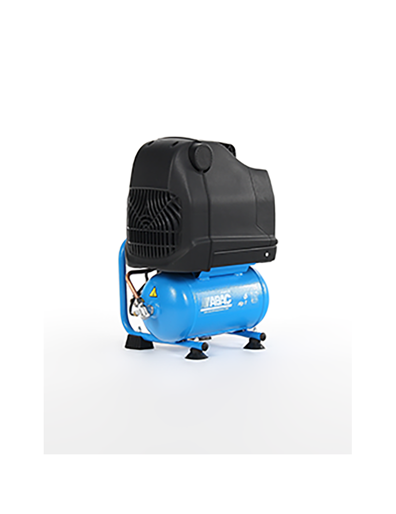 Compresor Insonoro sin aceite ABAC Serie SILENT. 2HP, depósito 6 lts, 108 lts/min., 10 bar, monofásico, 60dBA. Indicado para uso bricolaje y trabajos profesionales como clavadoras-grapadoras. Elementos protegidos con bastidor metálico.