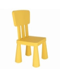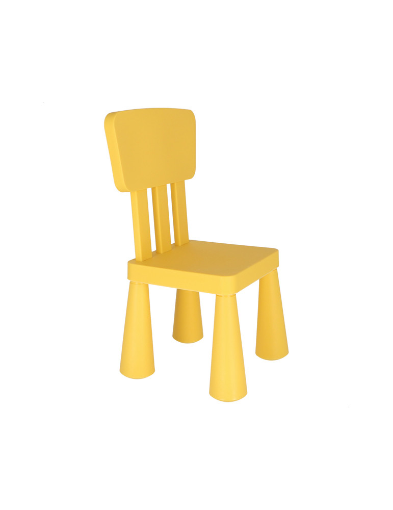 Silla infantil fabricada en plástico fuerte y resistente. Respaldo cuadrado. Patas a presión. 38 x 35 x 67 cm. Color azul o amarillo.