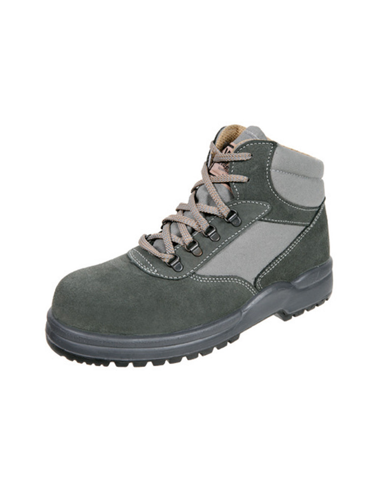 Bota en piel serraje natural transpirable y muy resistente. Puntera y plantilla de acero. Cierre mediante cordones. Suela bidensidad PU/PU. Tecnología optimal sole, mayor flexibilidad, mayor ligereza y mayor estabilidad en la pisada. Plantilla interi