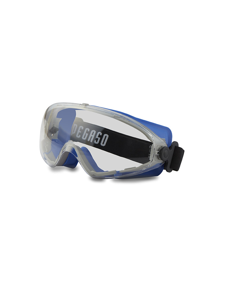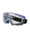 Gafa de seguridad antilíquidos. Montura integral con gran visión panorámica. Frontal sobre inyectado en goma antideslizante. Su diseño está pensado especialmente para permitir indistintamente su uso sobre gafas correctoras o sin ellas.